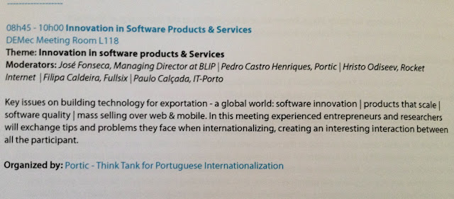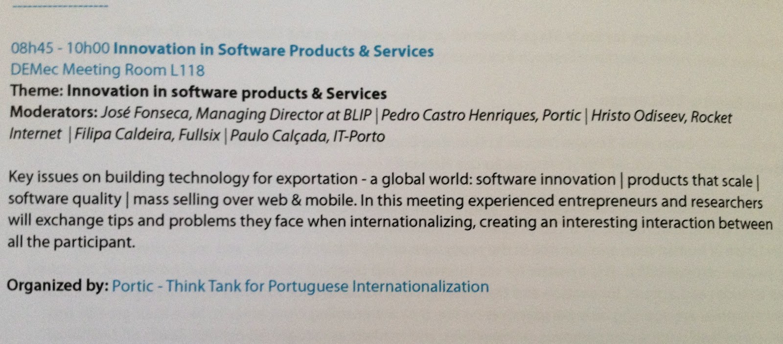 The topic of our talk was "Innovation in software products & services" and focus was on software innovation, scalability, quality and mass selling over web & mobile. Before I get carried away with some insights from the events I want to thank Filipa Caldeira from Fullsix, Jose Fonseca from BLIP, Luis Monçao from ROFF, Hugo Magalhaes from EuroCloud - it was great hearing your experience and views!
